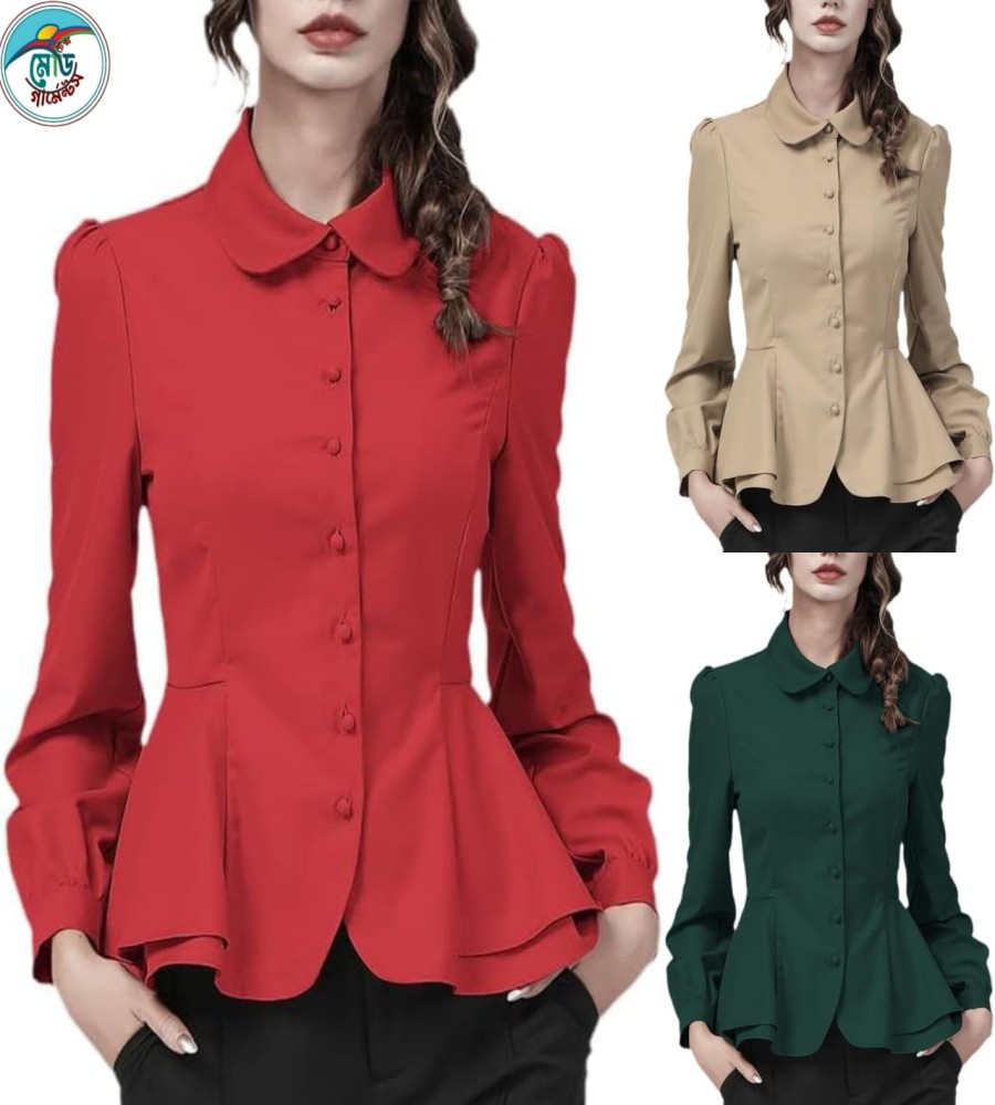 850 view ProductWomen's Long Sleeve Shirt Peter Pan Collar Solid Color Retro Bodycon Button-Down Top Slim Ladies Work Dress Shirts