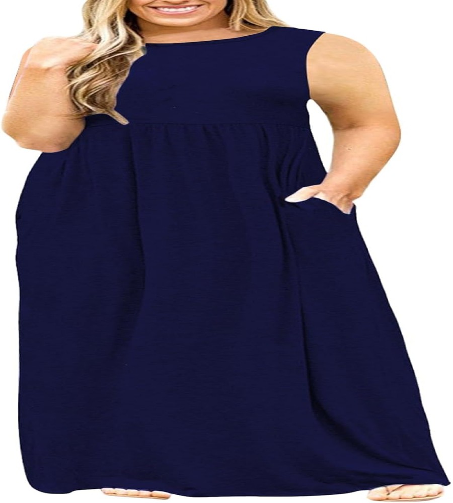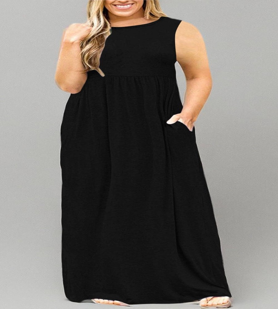 Features: Sleeveless, Casual Simple Style, Two Side Pockets, Round Neck, Floor Length, Elastic at Waist, Not lined, Plus Size Maxi Dresses