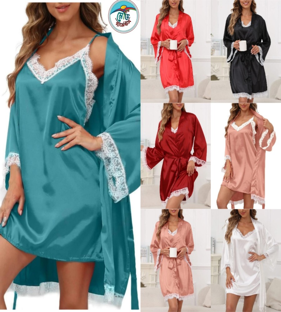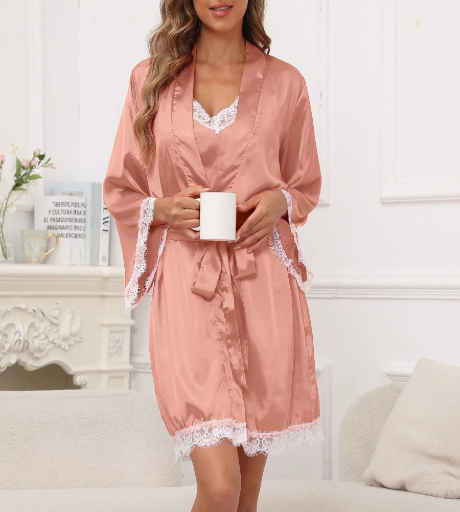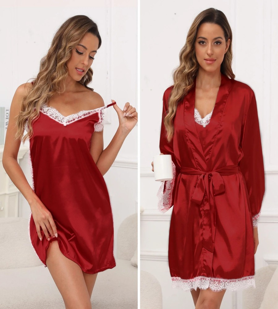 Unwind in timeless elegance with this 2-piece silk nightwear set, featuring a sultry V-neck slip dress and a matching belted robe. Designed from premium satin-silk fabric, this set brings a smooth, cool touch to your skin and elevates your bedtime ritual. Lace detailing along the neckline, cuffs, and hem adds a romantic finish, making this ensemble perfect for lounge days or special evenings.
