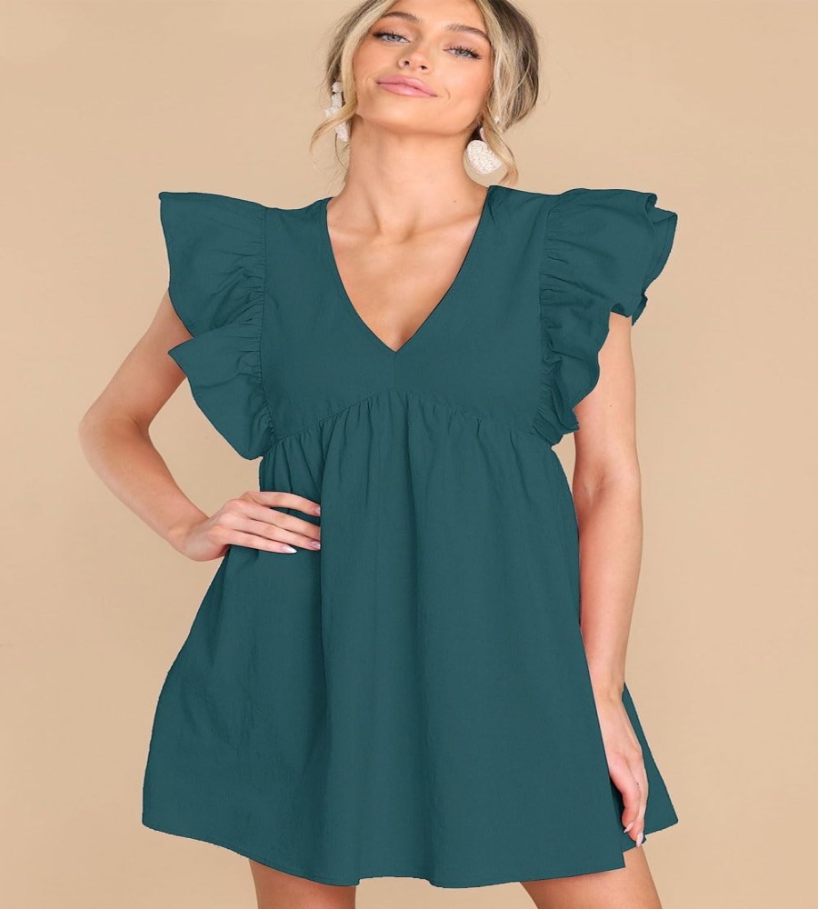 Step into effortless charm with this women's cotton soft mini dress, designed with delicate ruffle sleeves and a flattering V-neckline. The breathable cotton fabric ensures all-day comfort, while the flared A-line shape creates a breezy, feminine flow. Perfect for brunches, casual days, or vacation strolls, this dress pairs style with ease, making it a versatile must-have for your summer wardrobe.