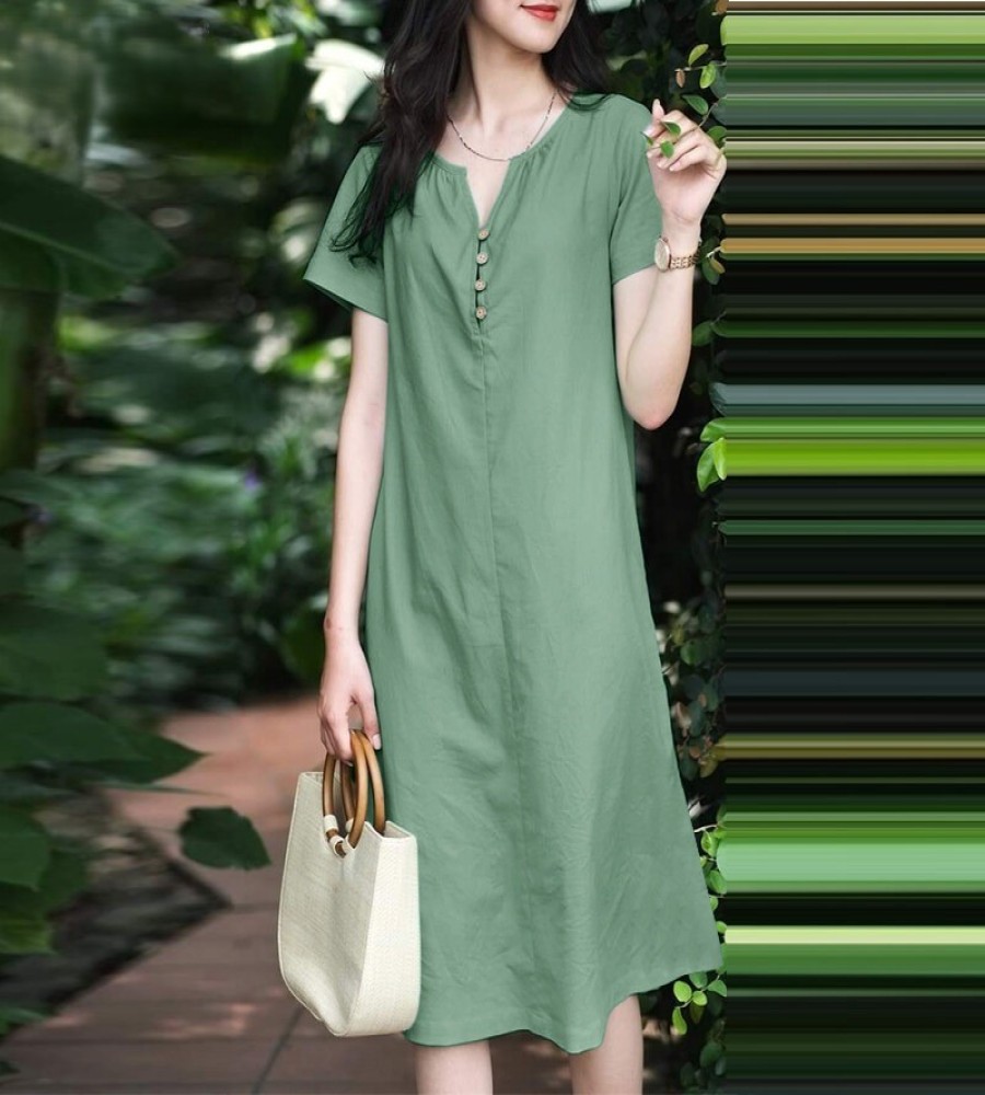 Crafted from a soft and breathable cotton linen fabric, this women’s midi dress combines effortless style with everyday comfort. Featuring a modest neckline with button-front detail, short sleeves, and a flowing midi length, it offers a versatile piece suitable for casual wear, workdays, or outdoor occasions.