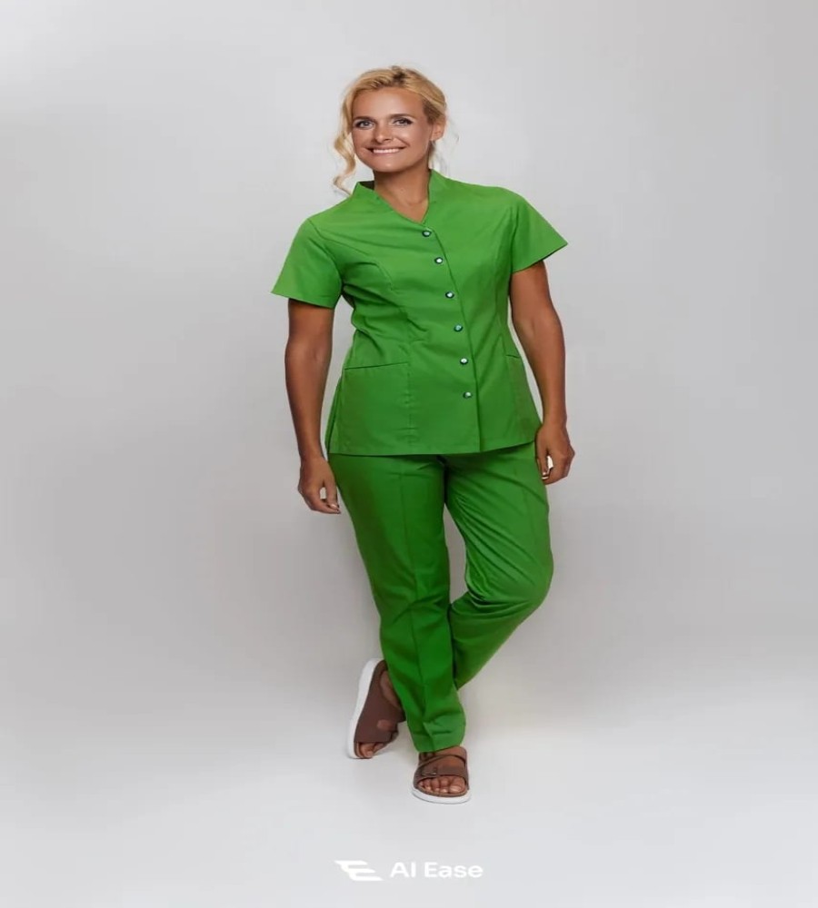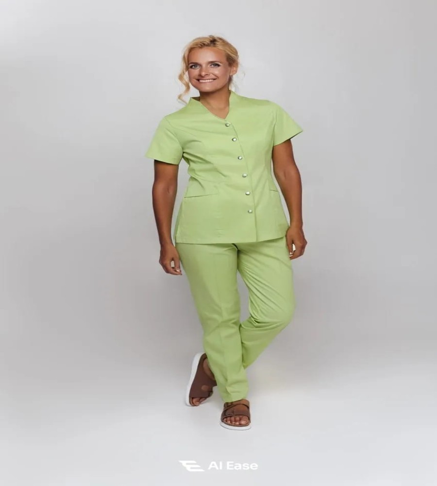 This stylish two-piece set includes a short-sleeve button-front top paired with straight-fit trousers for a sleek, modern look. The soft and breathable micro twill fabric ensures all-day comfort, while its durable, wrinkle-resistant nature keeps you looking polished throughout your shift.
