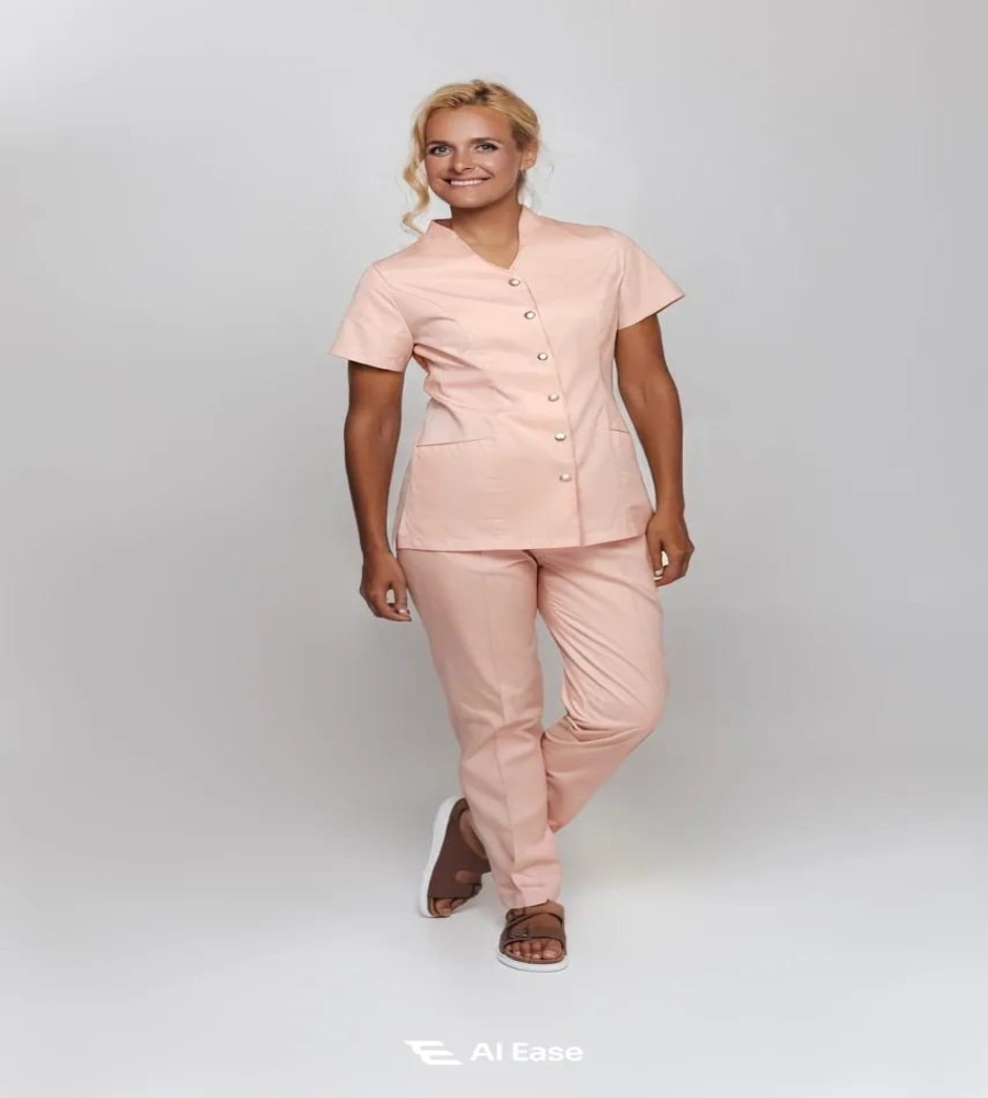 Designed with practicality in mind, this uniform features front pockets and comfortable elastic trousers that allow ease of movement—making it perfect for long working hours. Suitable for clinics, salons, hotels, and more, this elegant workwear blends functionality with contemporary style.
