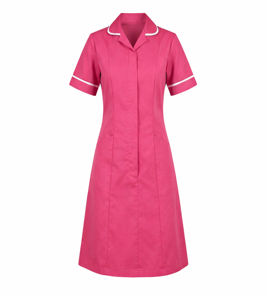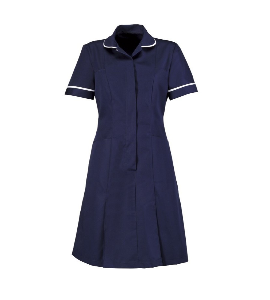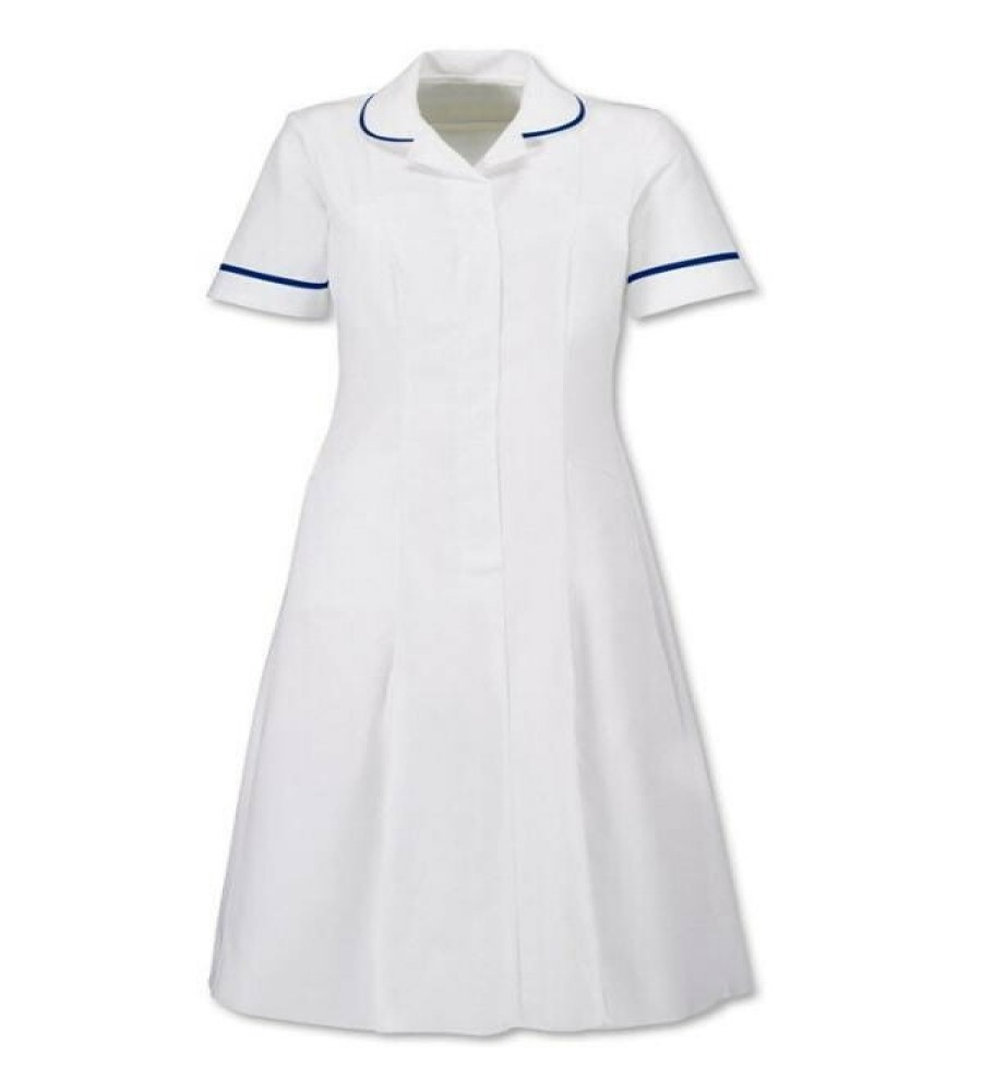 Designed with a classic notch collar and contrast piping detail, this uniform maintains a clean and polished appearance. The front button closure provides convenience, while the knee-length cut offers modest coverage. Two functional side pockets add practicality for carrying small medical essentials.