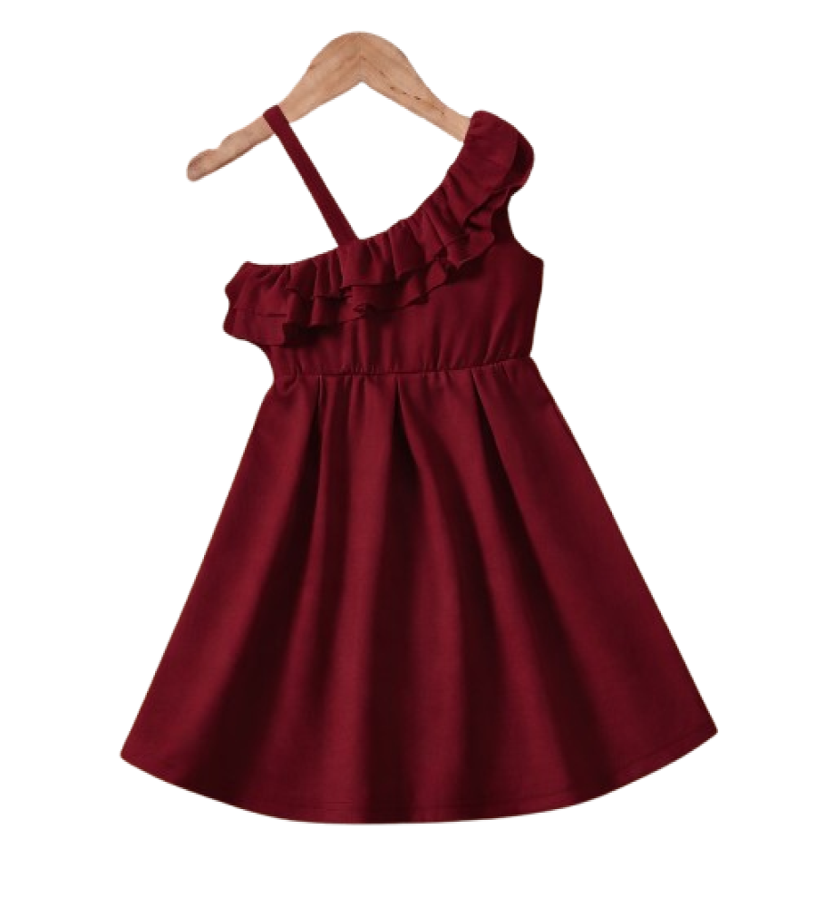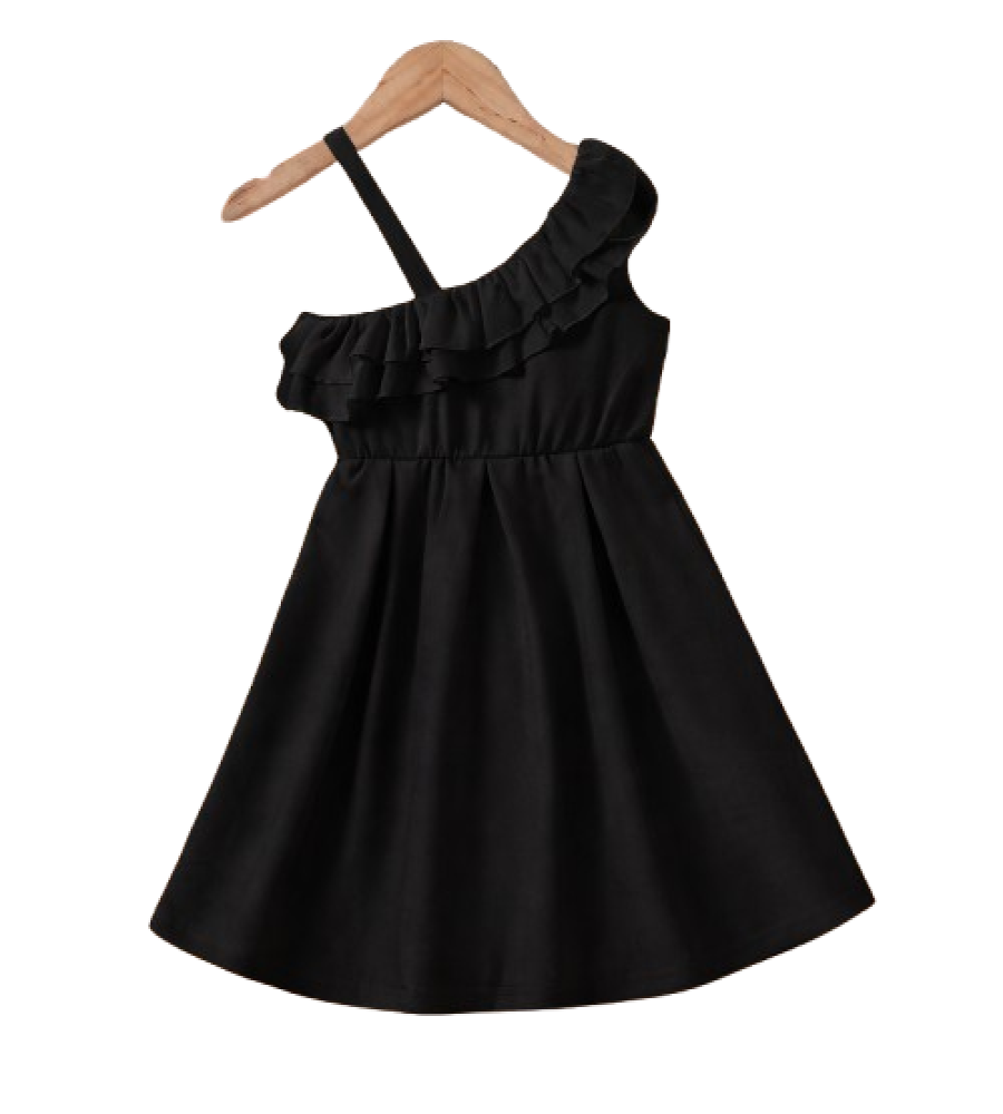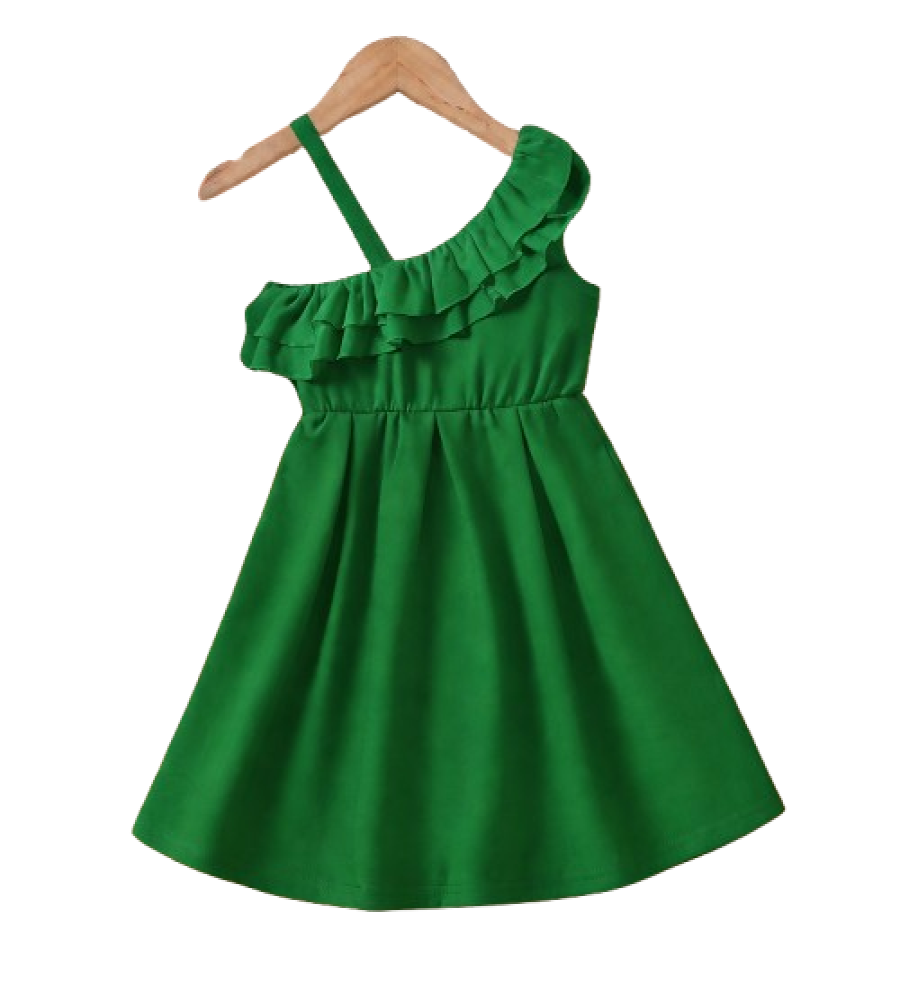 The stylish one-shoulder neckline is enhanced with layered ruffle detailing, adding a graceful and fashionable touch. The elastic waistline ensures a comfortable fit while maintaining a flattering silhouette. Its flared A-line design allows easy movement and creates a charming look for young girls.
