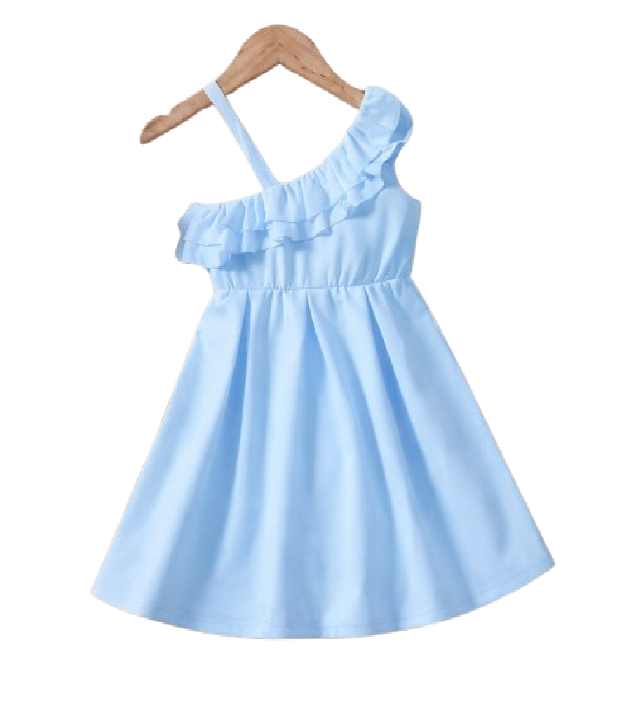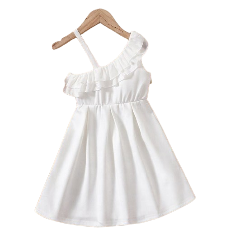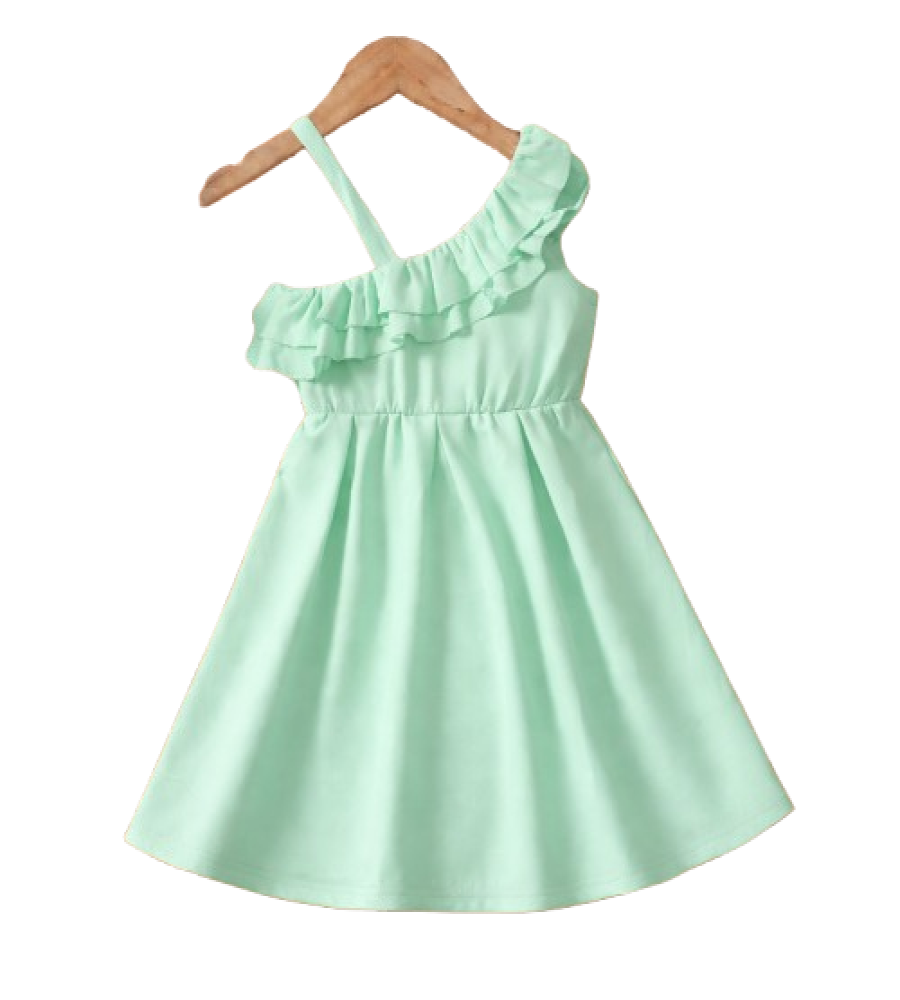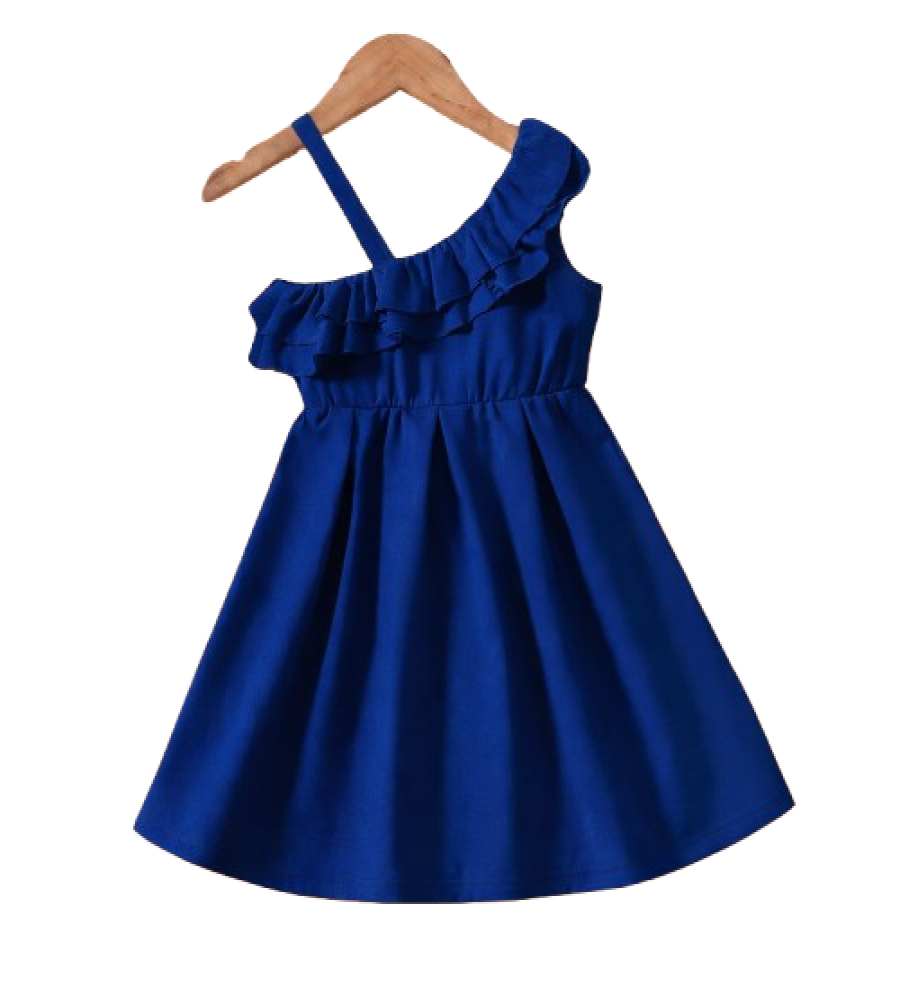 The stylish one-shoulder neckline is enhanced with layered ruffle detailing, adding a graceful and fashionable touch. The elastic waistline ensures a comfortable fit while maintaining a flattering silhouette. Its flared A-line design allows easy movement and creates a charming look for young girls.