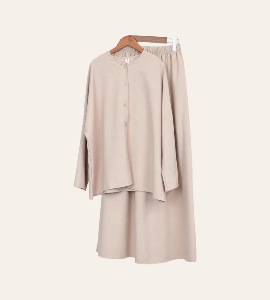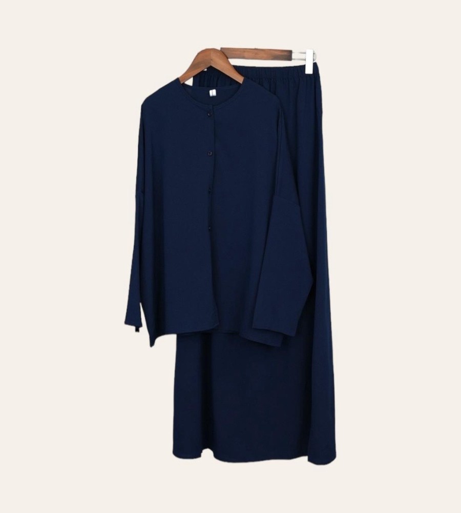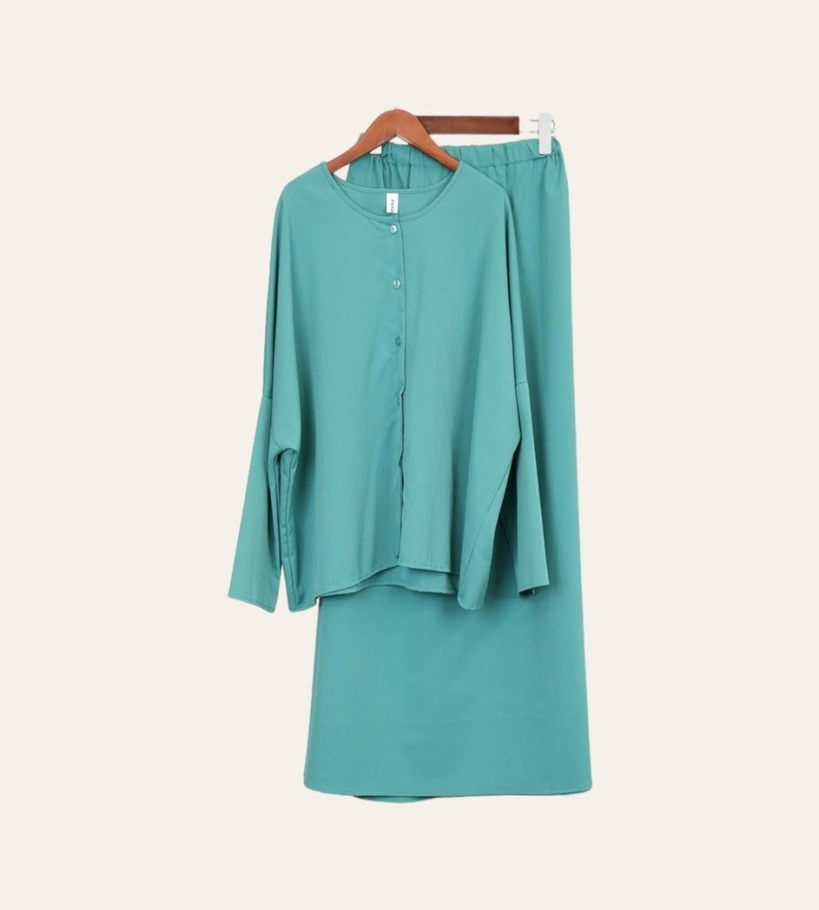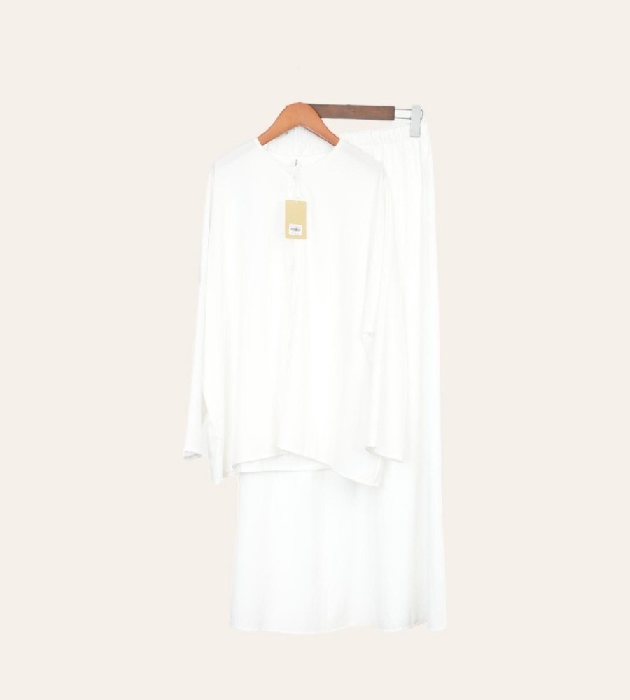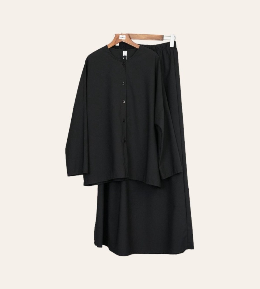The set features a stylish long sleeve top with a round band collar and front button closure for a clean and modest look. The matching skirt comes with a comfortable elastic waistband, allowing a relaxed fit while maintaining a graceful silhouette.