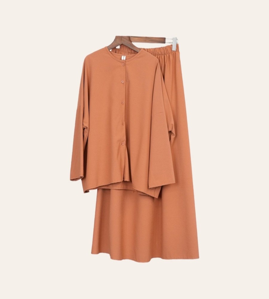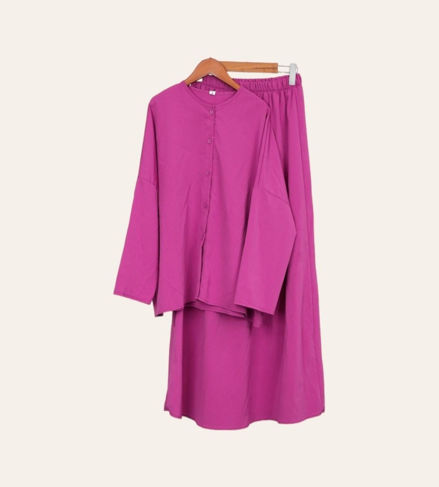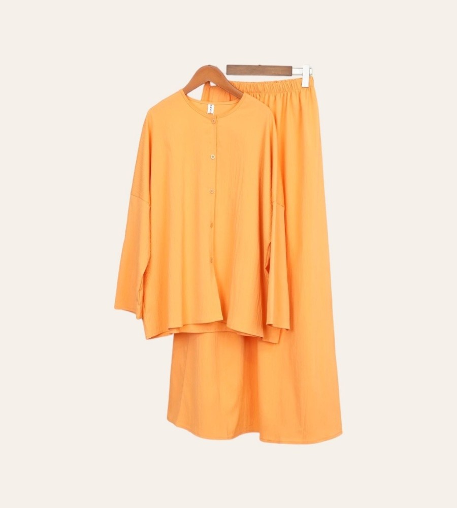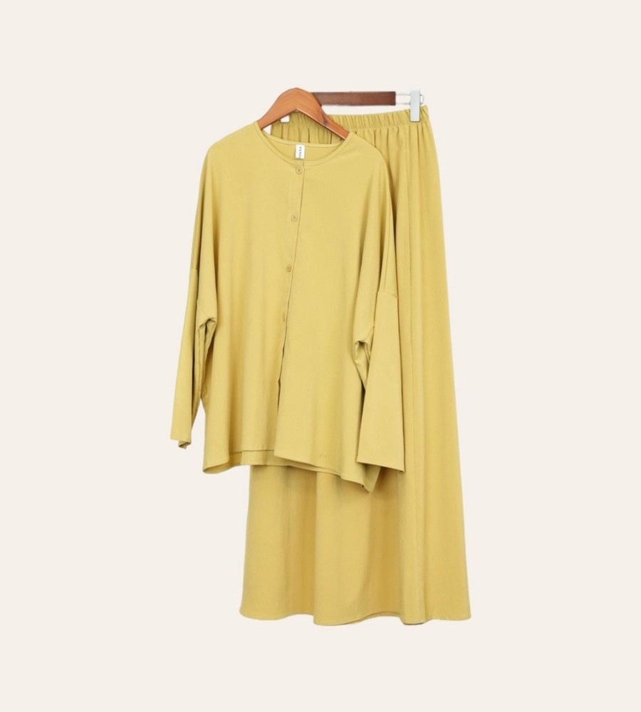 The set features a stylish long sleeve top with a round band collar and front button closure for a clean and modest look. The matching skirt comes with a comfortable elastic waistband, allowing a relaxed fit while maintaining a graceful silhouette.