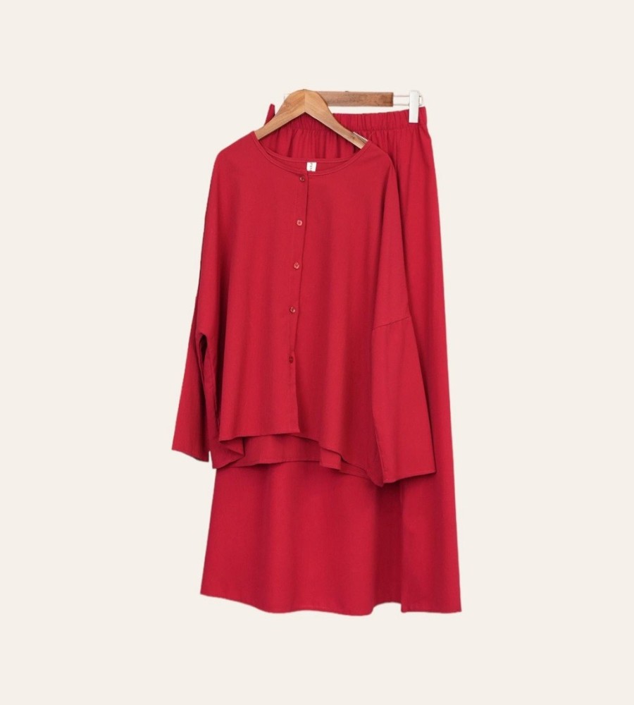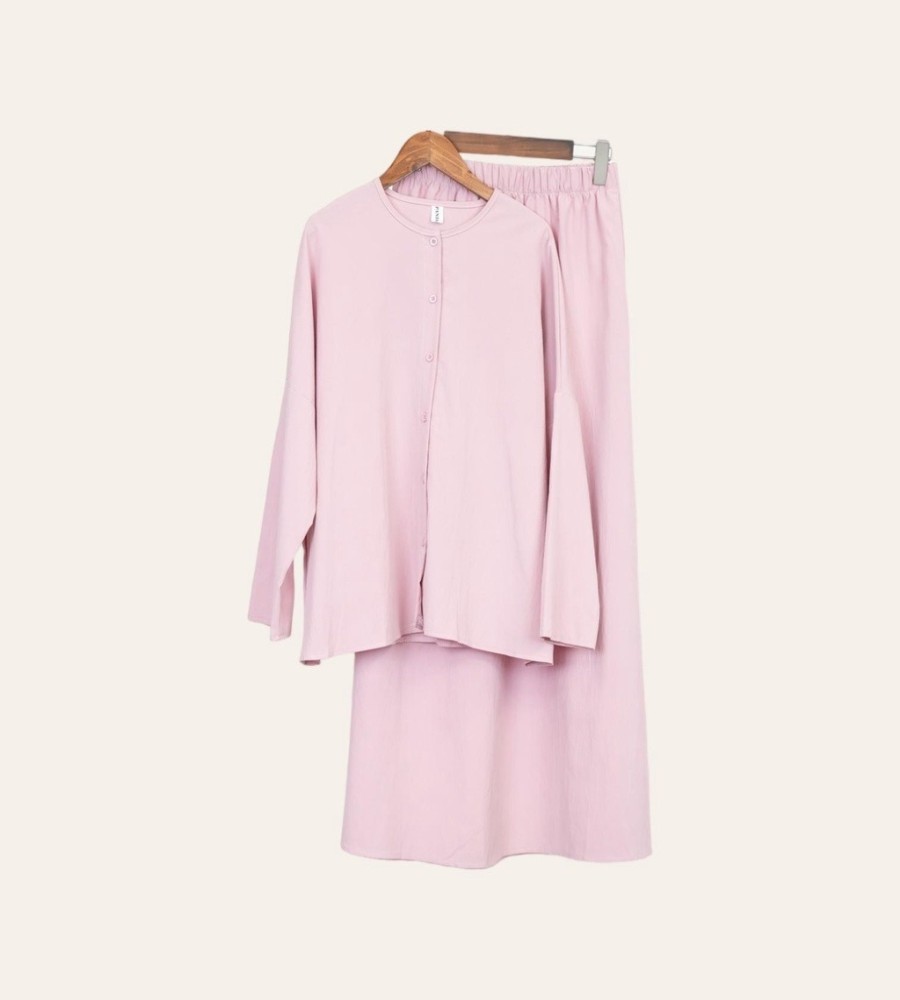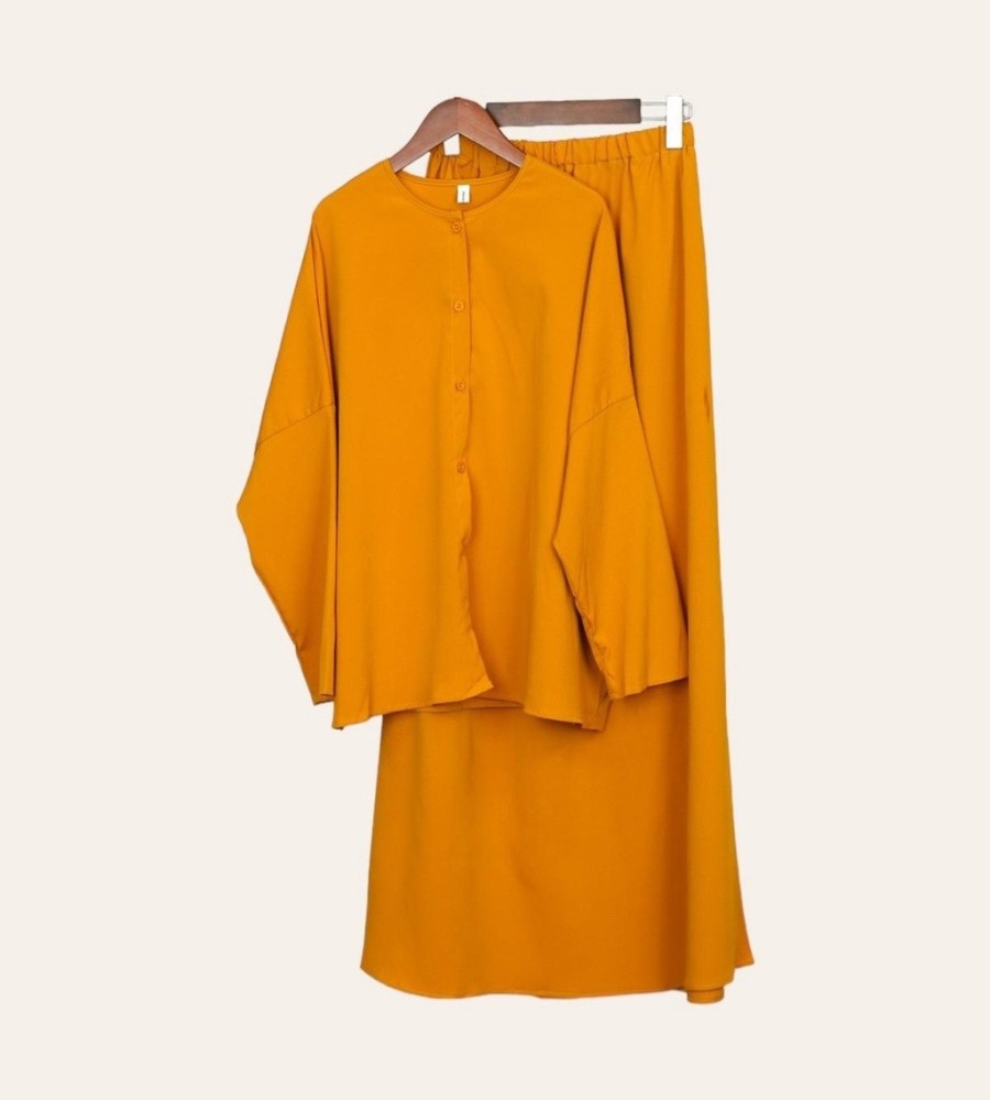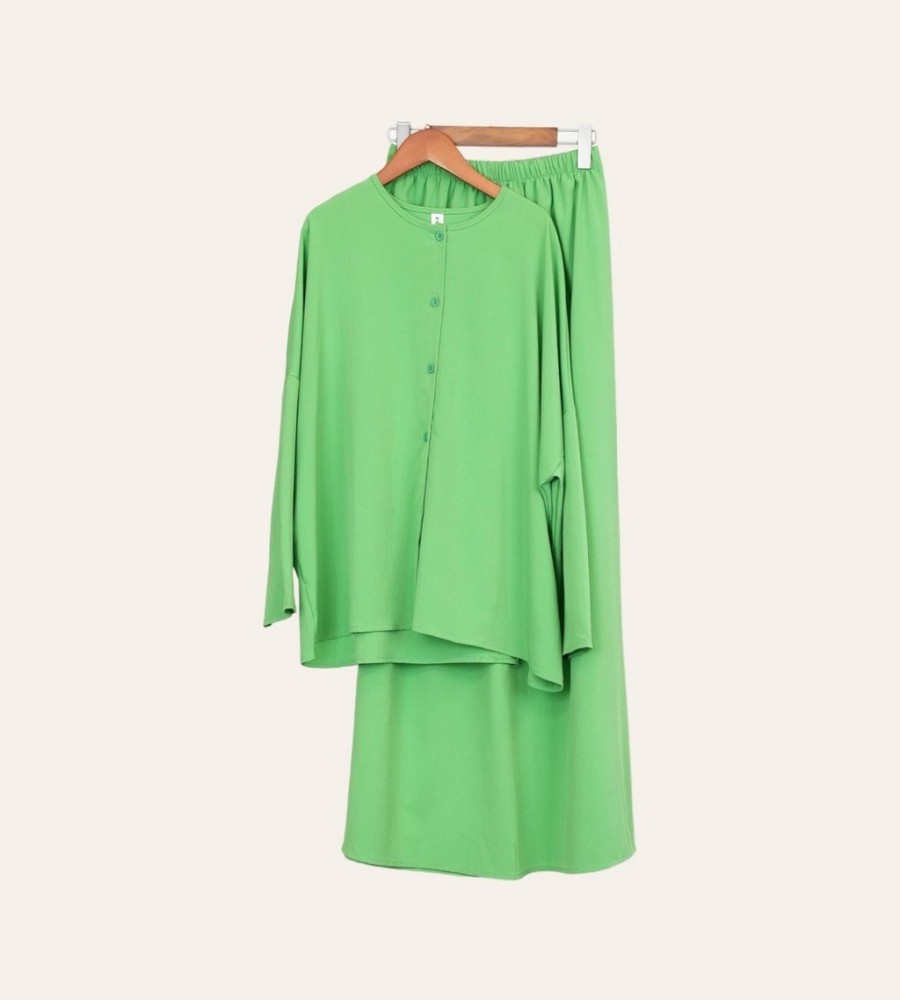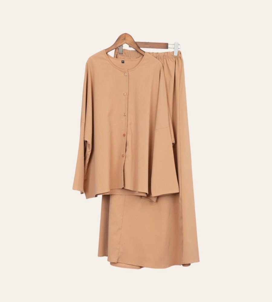 The set features a stylish long sleeve top with a round band collar and front button closure for a clean and modest look. The matching skirt comes with a comfortable elastic waistband, allowing a relaxed fit while maintaining a graceful silhouette.