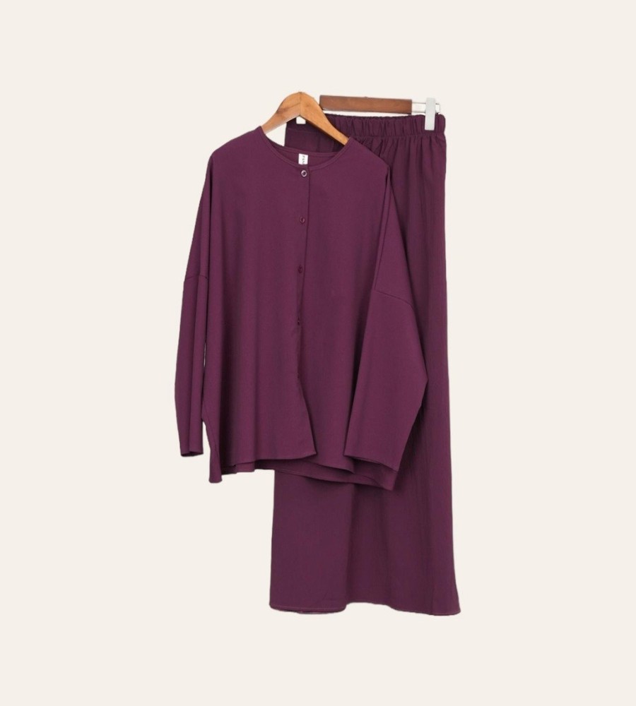 This elegant women’s two-piece outfit is crafted from premium cotton soft fabric, offering exceptional comfort and breathability. The lightweight and skin-friendly material ensures ease of movement, making it perfect for everyday wear and long hours of comfort.