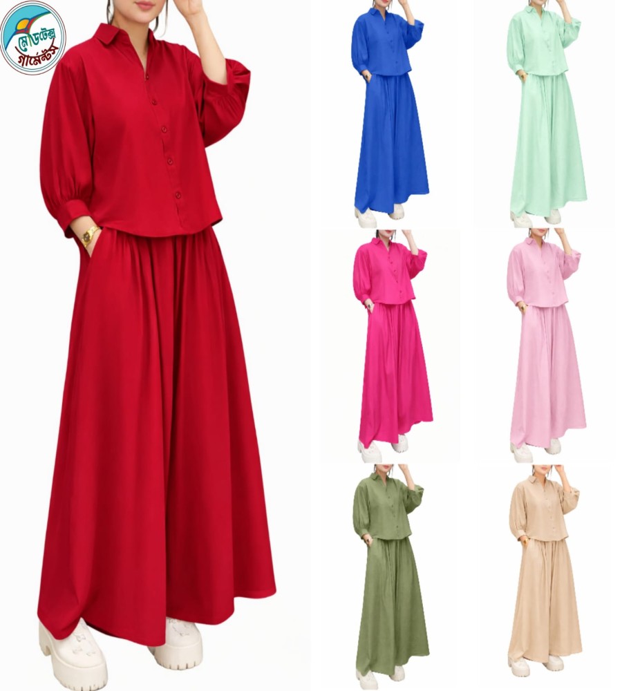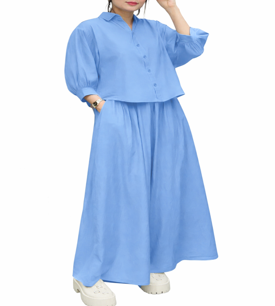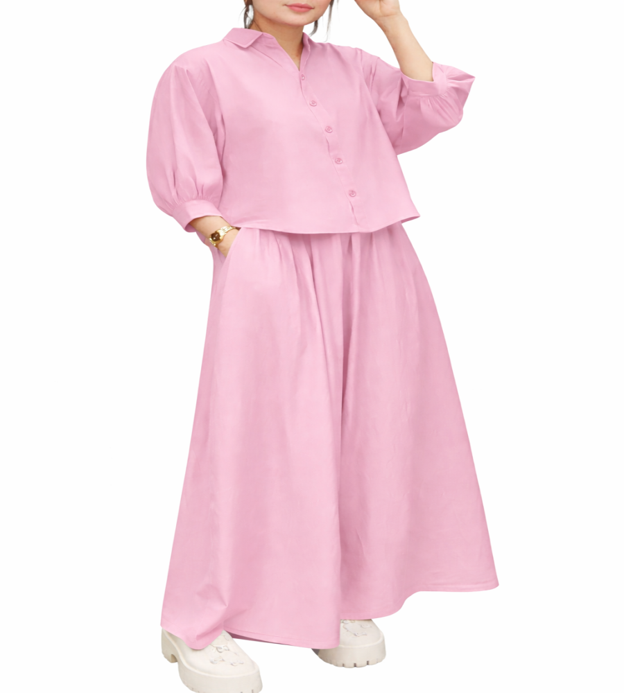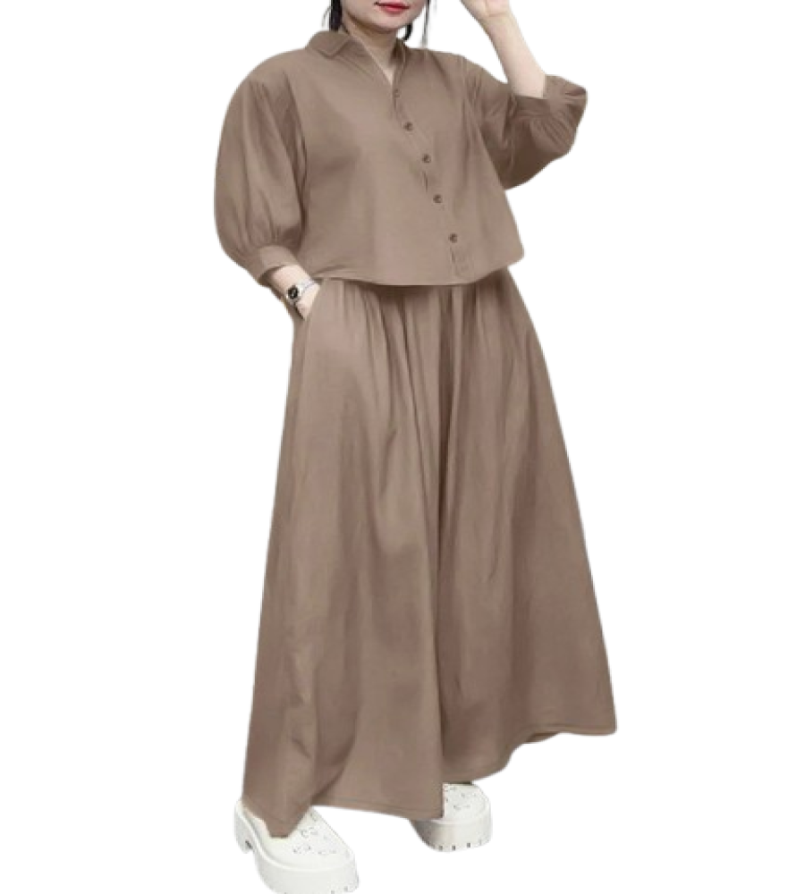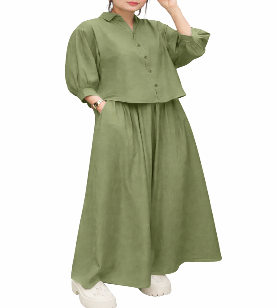 The outfit features a relaxed button-up top with a classic shirt collar and comfortable sleeves, creating a clean and modern modest look. The matching long skirt is designed with a comfortable elastic waistband that ensures easy wear and a graceful flowing silhouette.